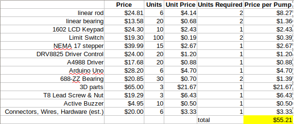Some of the open source designs seem to limit themselves on a particular syringe style or size. For instance, the touchscreen version can only accommodate a single syringe size without swapping out different 3D printed parts.(Garcia, Liu, and DeRisi 2018) I think researchers get excited about bespoke 3D parts when generic is often more suitable.