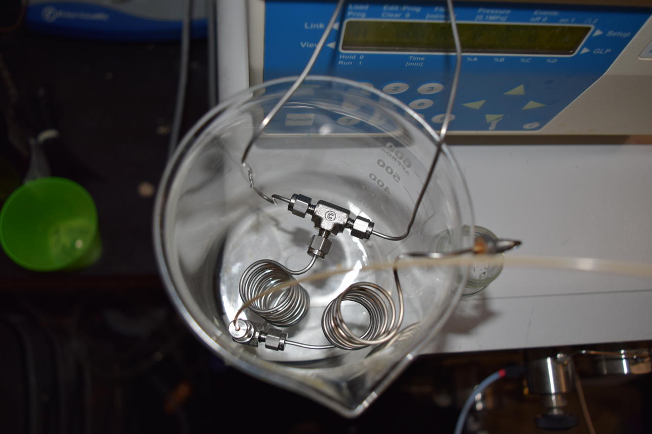 I’ve been constructing a test version of the microreactor using a few scavenged HPLC pumps. It consists of three inputs. Two are mixed together before the third is added. It is designed to be operated in a coolant bath.