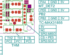 You can see the SPI2-MISO and SPI2-SCK connections listed under the thermocouple measuring header but no mention of MOSI or SS. So maybe the SPI interface of the MAX31855 is exposed for who know what reason? It might be possible to interface with the ARM chip through these connections or even bit bang the SPI interface on one of the other connectors, but I don’t think it is worth it. Time would be better served by starting with a better board.