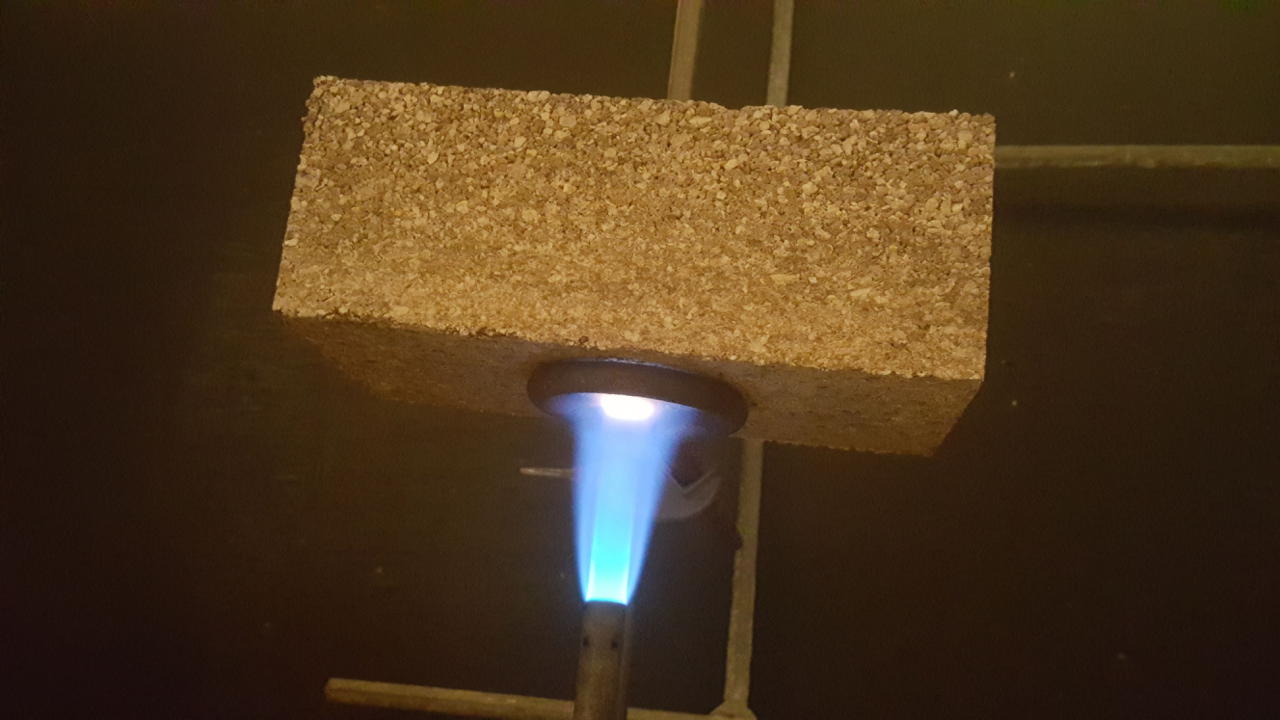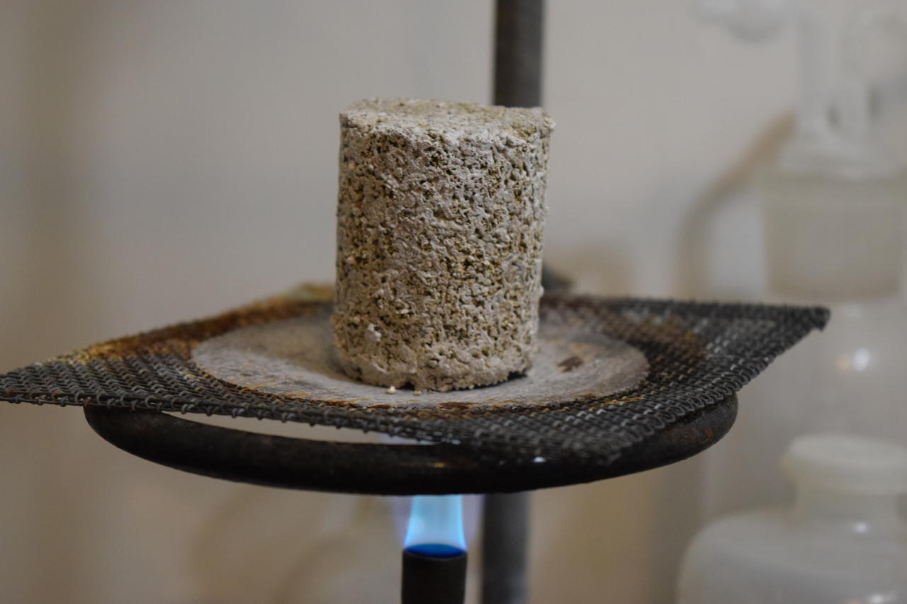 There’s quite a lot of expansion upon heating: 15% or more. The mix might have to be dried while compressed. Or heated more evenly in an oven. In any case, I stopped heating after a few minutes and the thing crumbled. More experimentation is needed.