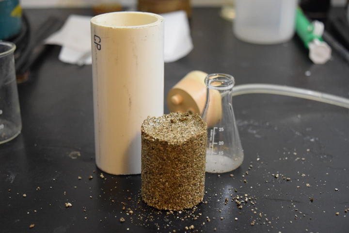This test run will be with 100ml of fine vermiculite and 10ml (12g total; 3.5g silicate) of my silicate solution. The ingredients are mixed in a baggie and poured into a 2 inch PVC section of 4 inches length. The mix is then compressed under my weight to a volume of about half. I then used a carbon dioxide generator to blow through about 1L of CO2, which is way more than required (25% by weight of silicate or 0.9g/400ml).