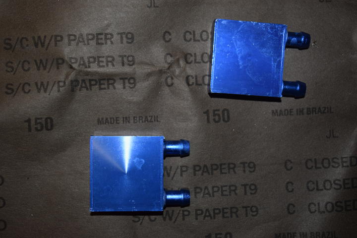 Phew! Leveling these cheap water blocks is a serious work out. First with 120 grit then 800. A belt sander would be so much easier. The leveling is more for equalizing the pressure on the TECs than efficient heat transfer.